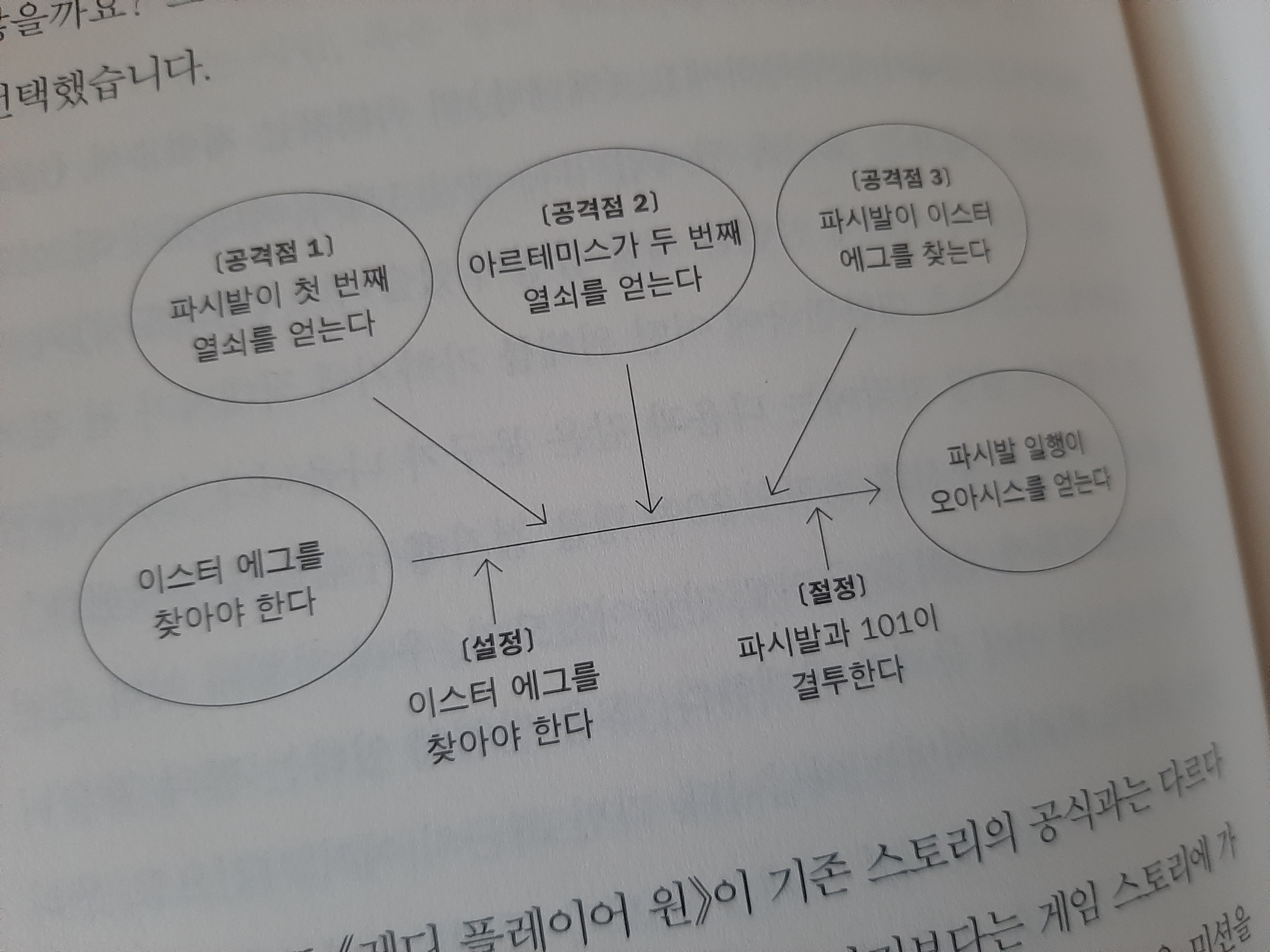 그리고 가장 도움이 되었던 부분은 오의 공식이다. 설정은 행동의 시작이고 중간점은 적대자 또는 어려움, 절정은 행동의 끝이다 설정에서 내용이 확대되고 이러한 부분이 일관적으로 절정에 이르러야 한다. 공격점 2(중간점)는 가장 큰 어려움, 메인 적대자로 구성되며 앞 뒤 공격점 1과 공격점 3은 쌍둥이처럼 중간점(공격점 2)을 받들고 있어야 한다.