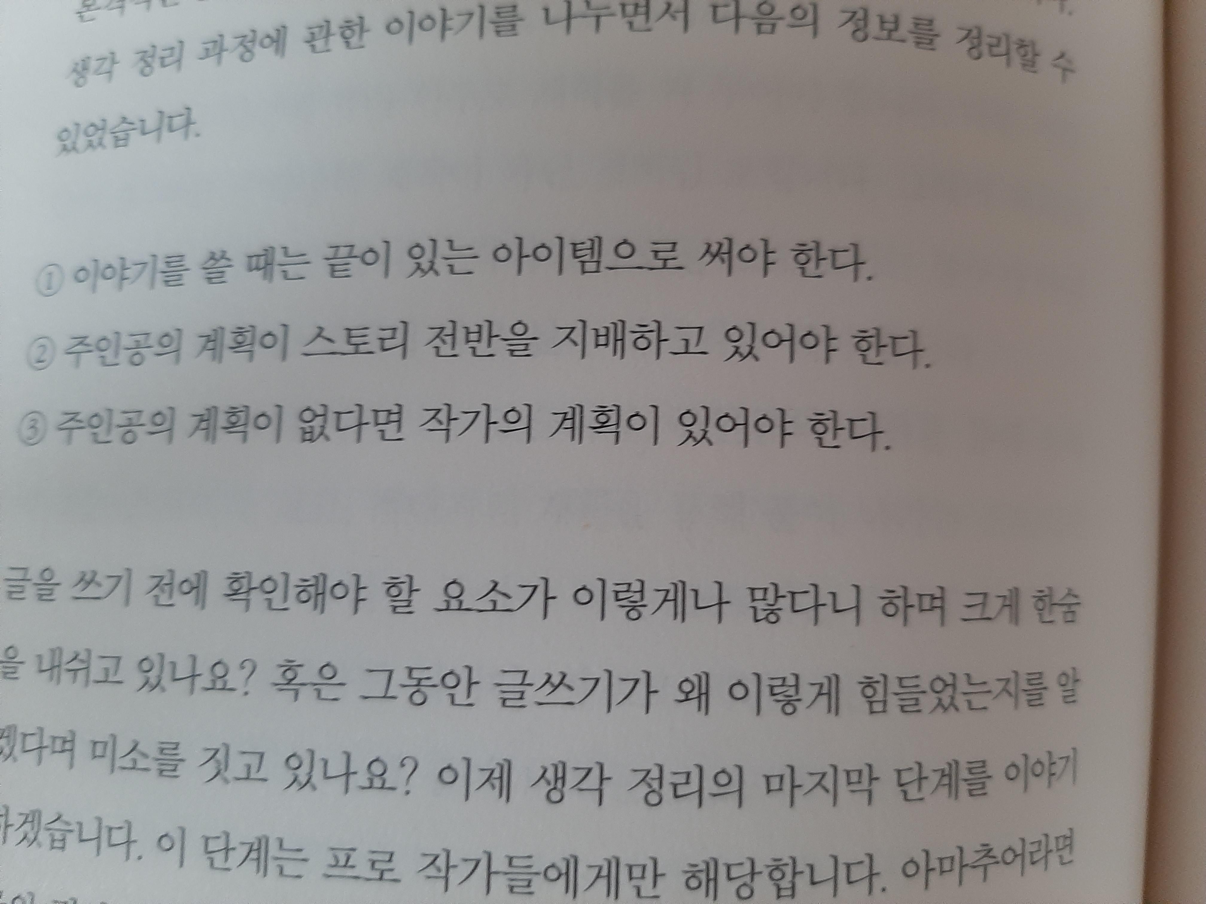그다음 본격적으로 스토리 창작에 대한 부분이 이어졌다. 창작의 순서(주인공 공식-가치 설정-설정과 절정-메인 적대자 설-표면 서사 심층 서사 설정-교차점검)와 세부적인 장르별 글쓰기의 방법도 이전에 소개된 내용과 결합하여 소개되었다.