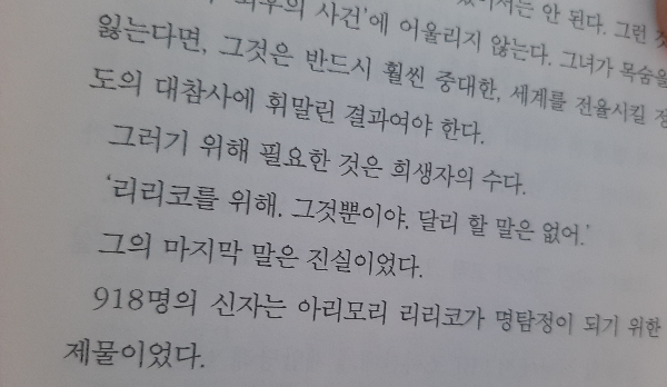 책에서 조든이라 불리는 사이비 교주가 기적을 부정하고 살아남는 것 대신 그를 긍정하고 죽는다고 했던 것처럼,