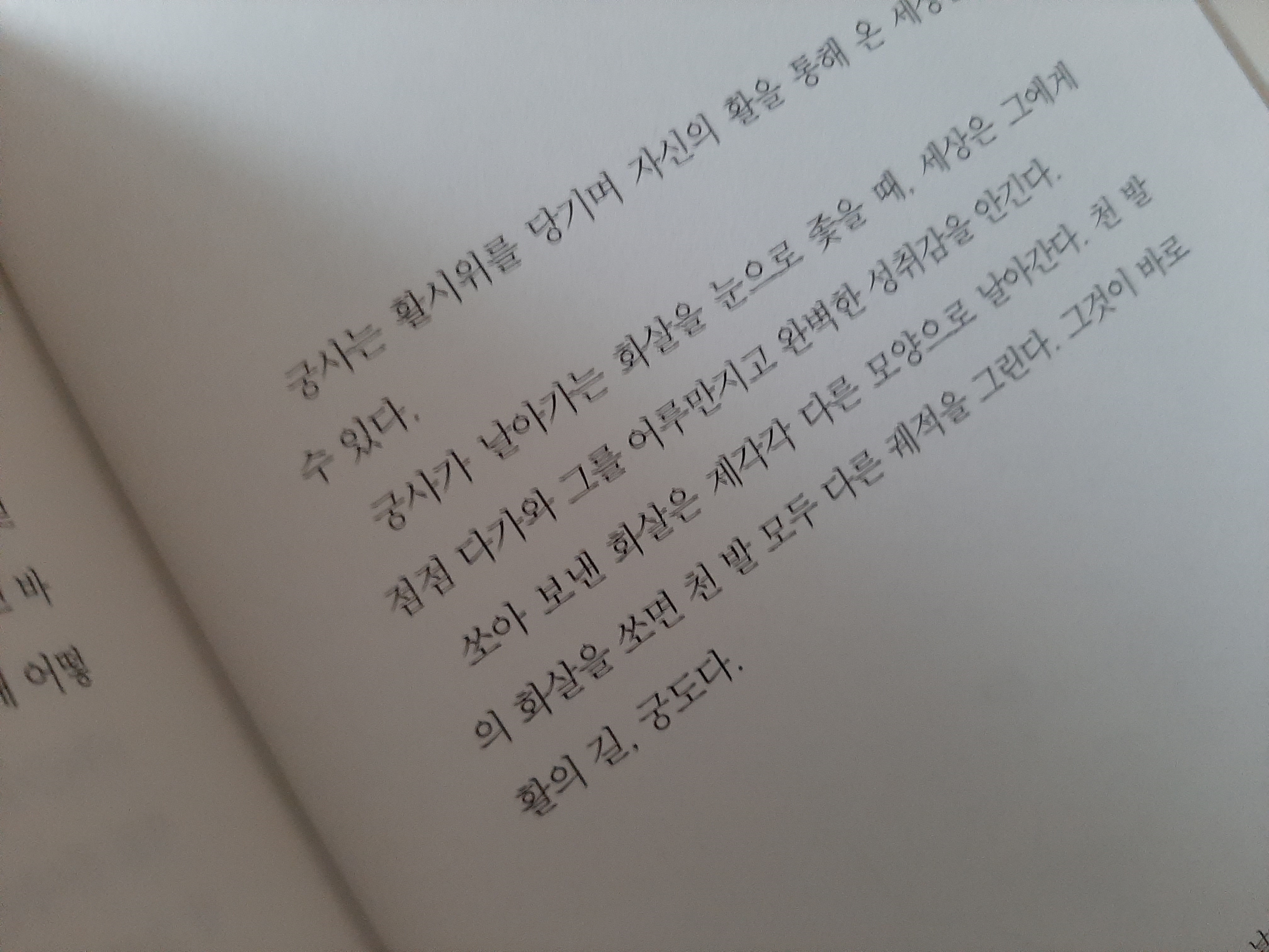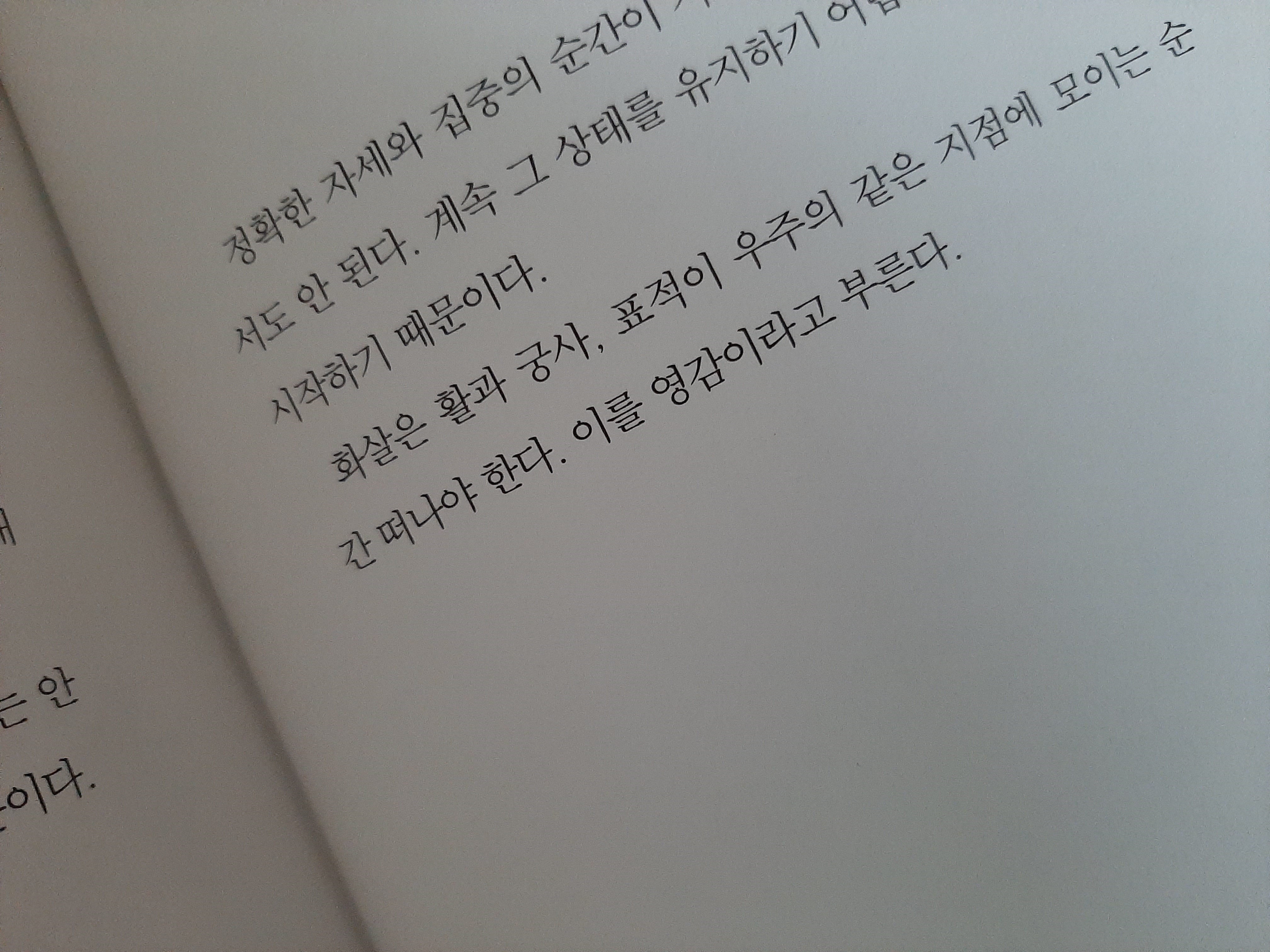 활을 쏠 때는 본인의 모든 것을 활용에 그에 집중해야 한다고 했다. 궁사의 몸이 잘못되면 화살을 명중시킬 수 없다 했다, 화살이 날아가는 동선을 잘 살펴보아야 한다고 했다.