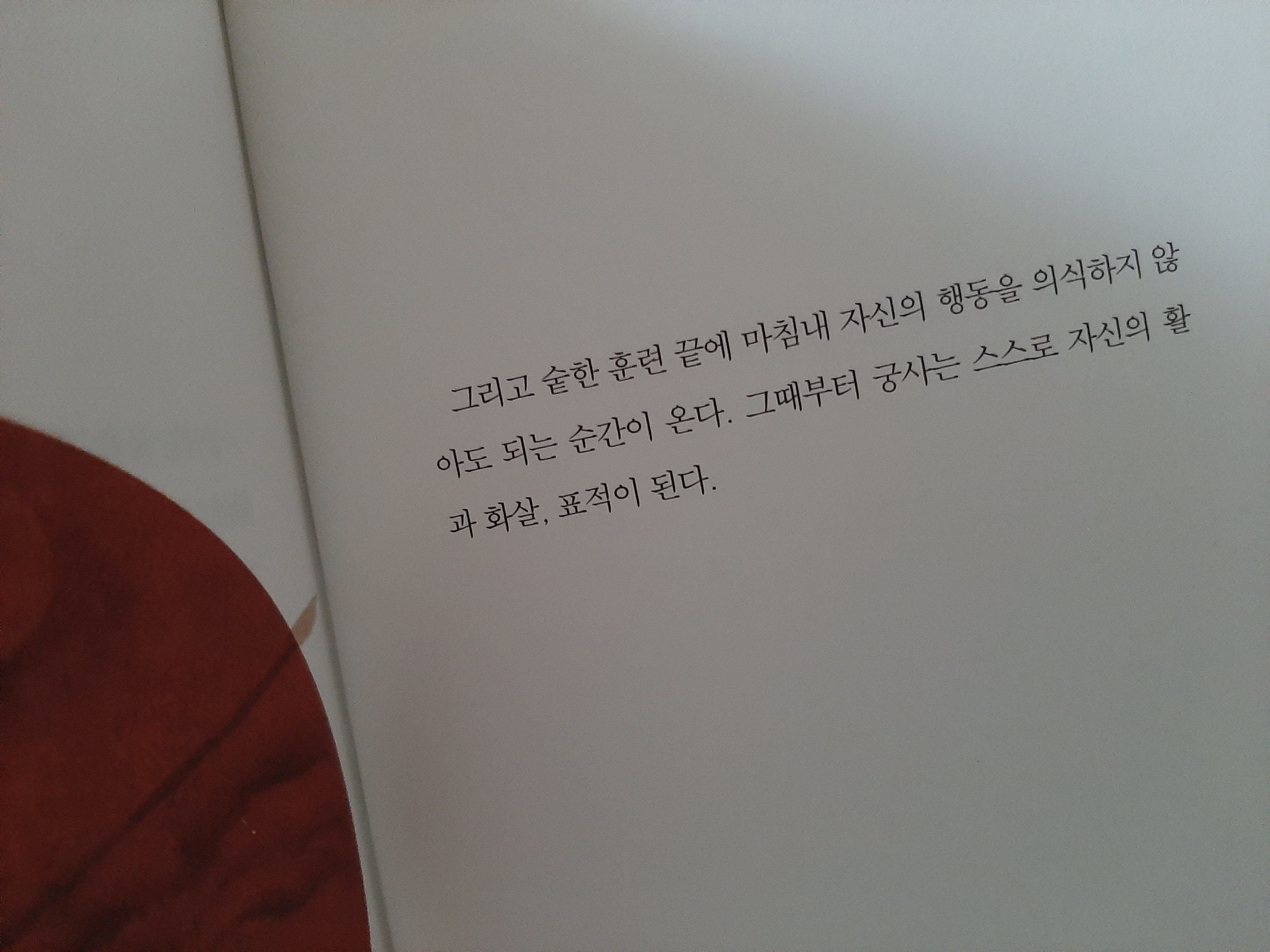 활을 당길 때는, 활은 악기이고 소리는 줄로 표현된다고 했다. 따라서 활을 쏠 때는 악기를 다루는 연주자처럼 그 시간에 집중하라 했다. 오선 위의 음표는 자체로는 아무것도 아니지만, 음을 담을 수 있는 사람은 음표를 선의 음표들을 소리와 리듬으로 만들어 낼 수 있다고 했다.