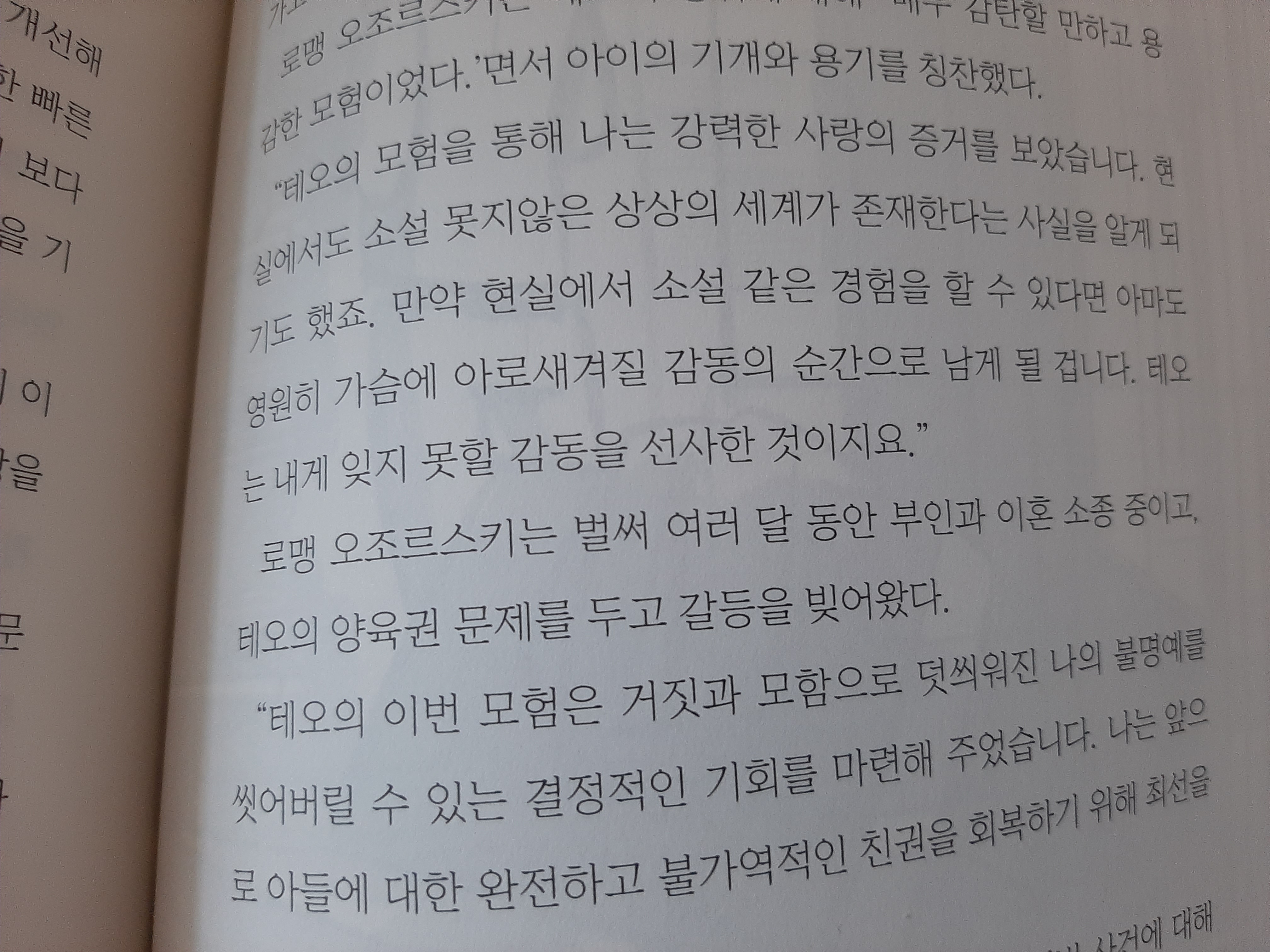 등장인물이 작가에 저항을 하며, 얽히고 섥히며 나아가는 이야기가 흥미롭다. 작가가 등장인물에 자신의 상황을 투영한 것도 재미있고, 상호 간 영향을 받으며 서로 성장하는 것도 의미 있게 다가온다. 한 인물 안에서 벌어지는, 인간의 무한한 창조성과 다중성, 심지어 영적인 신비로움까지 느껴졌다.